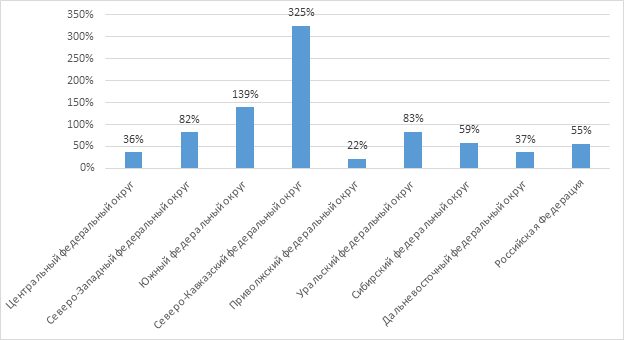 Наивысшие значения относительного прироста количества социальных предприятий (рисунок 3) были достигнуты в Северо-Кавказском (+325%) и Южном (+139%) федеральных округах, что в значительной степени было связано с наименьшей базой, относительно которой регистрировался рост количества предпринимательских структур. В 2020 г. в пяти из семи регионов Северо-Кавказского федерального округа ни одного социального предприятия зарегистрировано не было. Значительные показатели прироста Северо-Западного федерального округа (+82%) в большей степени были связаны с позитивной динамикой, наблюдавшейся в Вологодской и Ленинградской областях.
