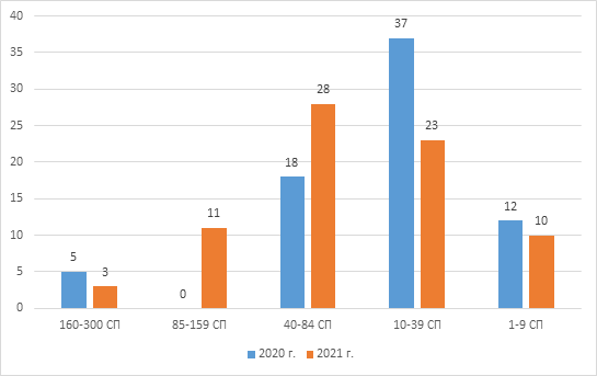 Отметим также, что наблюдается сокращение численности регионов с наивысшим интервалом количества зарегистрированных социальных предприятий [160; 300]. Это связано со значительным снижением численности анализируемых предприятий в г. Москва (-174 предприятия), а также с тем, что в Нижегородской области и в Республике Башкортостан, где в 2020 г. была зафиксирована высокая численность социальных предприятий, в 2021 г. согласно данных ЕРСМСП не было зарегистрировано ни одного предприятия анализируемого типа (возможные причины данной ситуации были обоснованы выше).