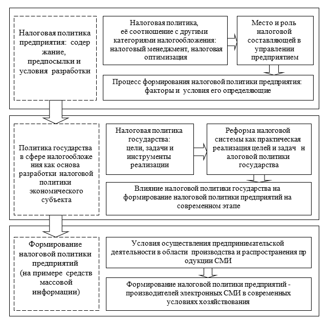 Е.С. Тютюнниковой был предложен методический инструментарий формирования налоговой политики на примере организаций средств массовой информации (СМИ) (рисунок-1). Она попыталась объяснить феномен налоговой политики предприятия как самостоятельной экономической категории и описать ее характеристики, определила место и роль налоговой составляющей в управлении компанией, выявила обстоятельства, влияющие на процесс разработки налоговой политики на микроуровне.