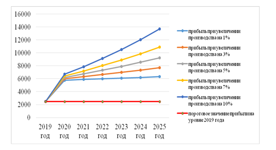 При ежегодном увеличении объемов производства даже на 1% возможен существенный прирост прибыли даже в 2021 году, который превышает уровень 2019 года и значительно увеличивается к 2025 году. Таким образом, рекомендовано наращивать объемы производства выделенных перспективных направлений развития сельского хозяйства не менее 1% в год.