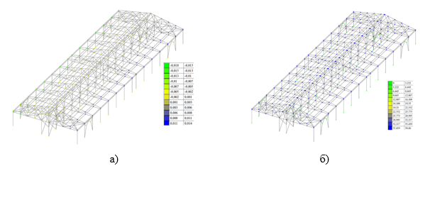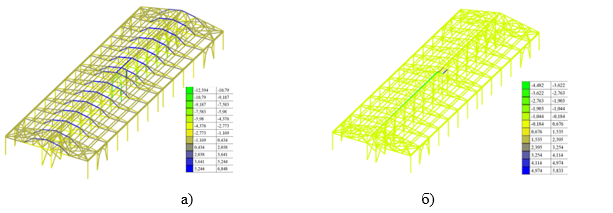 Были рассмотрены следующие загружения: загружение 1 – постоянная нагрузка от собственного веса несущих конструкций (рис.11, а); загружение 2 – постоянные нагрузки от собственного веса ограждающих конструкций (рис. 11, б); загружение 3 – полезная нагрузка (временная); загружение 4 – снеговая нагрузка полная; загружение 5 – снеговая нагрузка справа; загружение 6 – снеговая нагрузка слева; загружение 7,8 – средняя составляющая ветрового давления; загружение 9,10 – ветровая нагрузка с учетом пульсаций; загружение 11 – сейсмика по Х; загружение 12 – сейсмика по У.