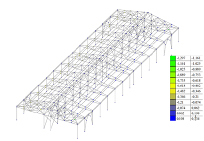 Результаты расчета представлены на рис. 12 (перемещения по осям), рис. 13 (внутренние усилия), 14 (коэффициенты использования).