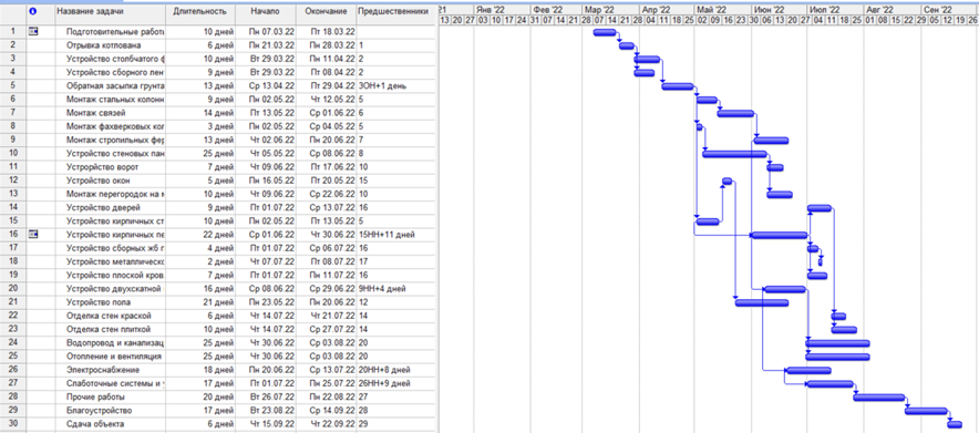 На основании результатов расчета продолжительности был построен график производства работ (рис. 14). Продолжительность работ составила 171 день.