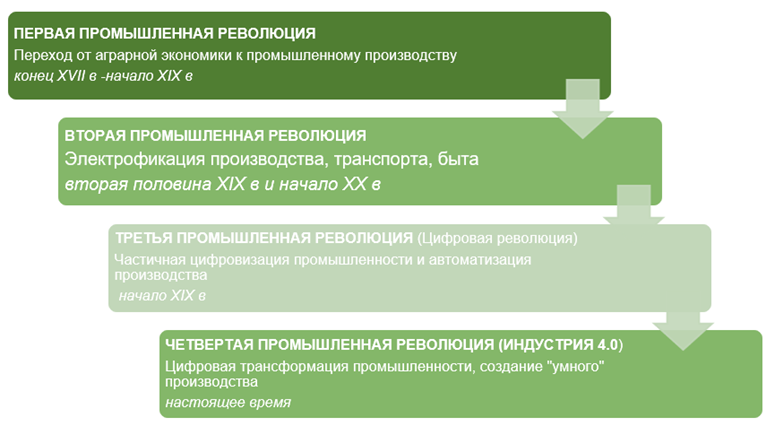 Развитие человечества неразрывно связано с изменением методов и подходов в различных областях его жизнедеятельности, что подтверждается историей. Так, например, первая промышленная революция произошла в ведущих государствах мира в XVIII—XIX веках. Характерной чертой этого промышленного переворота стал массовый переход от ручного труда к машинному, от мануфактурного производства к фабричному. И этот пример не один, на рис.1 представлены основные аспекты трансформации промышленности с течением времени.