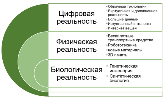 Четвертая промышленная революция, толчком для которой стал мировой экономический кризис 2008 года, который показал, что возможности используемых в то время информационно-коммуникационных технологий оказались исчерпаны, связана с развитием полностью цифровой промышленности. Вот почему в то время остро встает вопрос о необходимости разработки новых прорывных технологий в производственные процессы, решением которого в 2011 году становится стратегическая инициатива развития промышленности Германии «Платформа «Индустрия 4.0». Практически одновременно аналогичные программы запускаются в Бельгии, Великобритании, Италии, Нидерландах, Франции, Китае и других странах. В нашей стране вводится термин «передовые производственные технологии». При этом одним из ключевых аспектов совершенствования промышленности при развитии концепции «Индустрия 4.0» объявляется применение в заводских процессах киберфизических систем (КФС), внедрение которых обеспечивает полную интеграцию вычислительных ресурсов в физические процессы. При этом внедрение КФС предполагается как в промышленность, так и на транспорте, в энергетику и даже системы жизнеобеспечения. Вместе с тем связующим звеном между физической, биологической и цифровой реальностями становятся информационные технологии. На рис.2. представлены примеры технологий, входящих в физические, биологические и цифровые блоки.