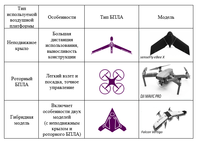 Несмотря на то, что на рынке представлено большое количество дронов, в строительной отрасли обычно используются промышленные дроны [2]. В зависимости от типа используемой воздушной платформы [3] существует три основных типа БПЛА (таблица 1):