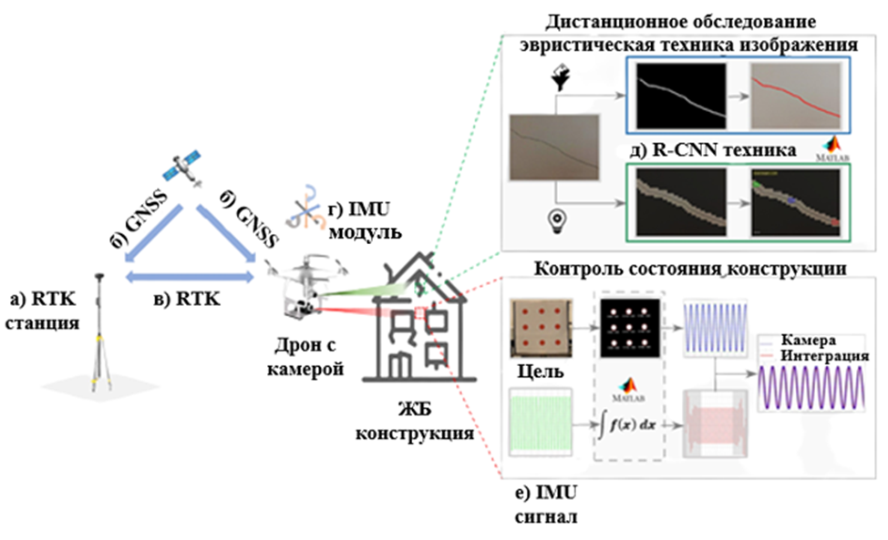 На рис. 1 представлен обзор интегрированной методологии дистанционного осмотра и мониторинга железобетонных конструкций, поддерживаемых БПЛА. БПЛА оснащен высокоточной системой спутниковой навигации (GPS), которой помогает система коррекции положения типа кинематики в реальном времени (RTK - Real Time Kinematic) при поддержке местной станции. БПЛА также оснащен собственной камерой, которая обеспечивает высокоточные изображения с географической привязкой.
