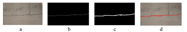 Рис. 2 Алгоритм эвристического признака: а) исходное изображение; б) метод Канни; в) расширение краев, пломбирование и эрозия; г) усиленная трещина.