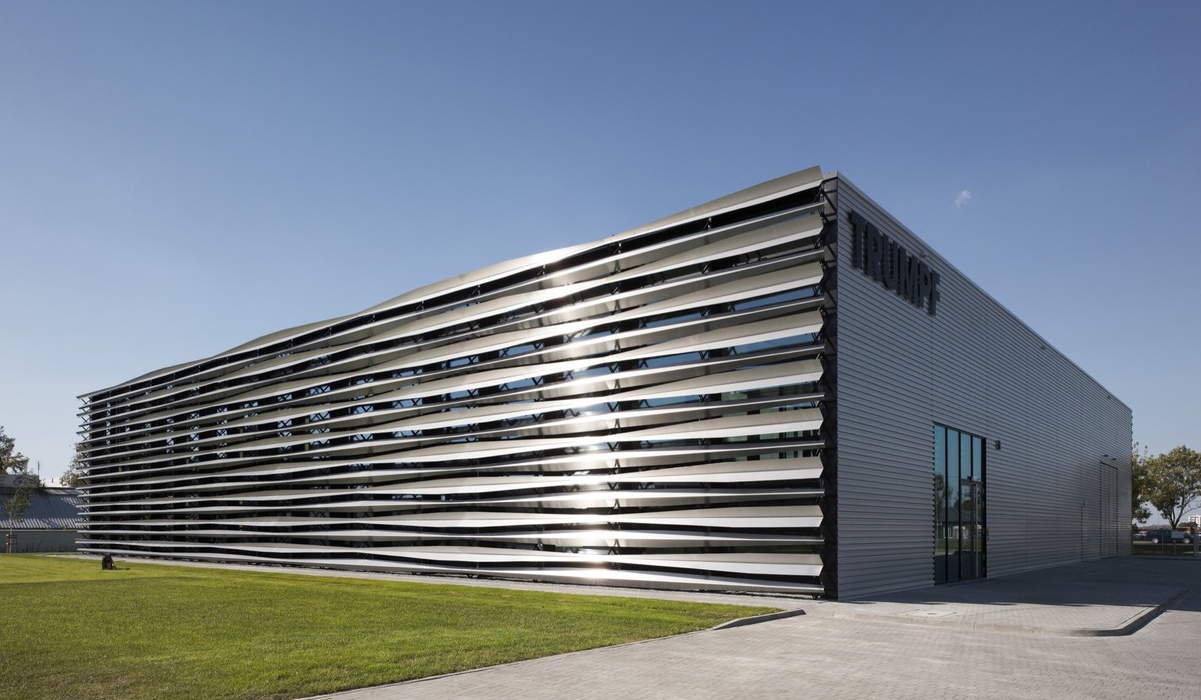 2. В контексте согласованности архитектурных решений передовых производственных предприятий с позициями устойчивой архитектуры актуальна интерпретация энергоэффективных и ресурсосберегающих решений, как элементов, формирующих их архитектурный образ [9]. Солнцезащитные устройства, перфорированные оболочки и другие элементы двойного фасада, озеленение и некоторые виды источников альтернативной энергетики значительно обогащают образ современной промышленной архитектуры. В качестве примера можно привести здание лаборатории «Метальса» (арх. бюро Brooks + Scarpa Architects, Мексика, 2013), главный фасад которого на две трети покрывает солнцезащитная алюминиевая перфорированная оболочка. А в совокупности с формой шедовых фонарей, формирующих уникальный силуэт, создается запоминающийся архитектурный образ. Технологический центр «Трамф» (арх. бюро Barkow Leibinger Architects, Польша, 2016) решен в форме прямоугольного параллелепипеда; на его южном фасаде установлены горизонтальные волнообразные ламели, которые не только защищают интерьер от солнечных лучей, но и придают динамичности внешнему виду лаконичного объекта (рис. 2). Необходимо отметить, что эта солнцезащитная конструкция изготовлена из металла на оборудовании самой фирмы «Трамф» (высокоточные станки для лазерной резки), то есть эстетическое решение фасада одновременно служит и демонстрацией производственных возможностей предприятия.