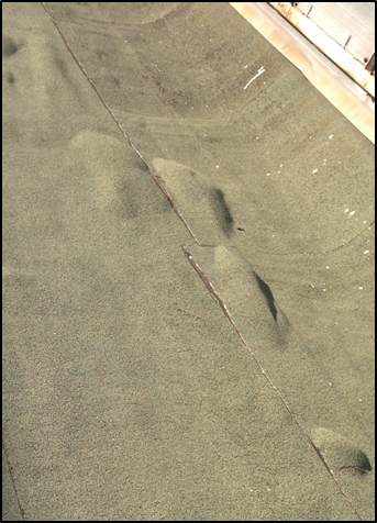 Трещины и разрывы - так же является очень распространенным повреждением рулонного гидроизоляционного ковра. Причинами повреждения является износ рулонного гидроизоляционного покрытия. Постоянное воздействие солнечных лучей и атмосферных осадков приводит к потере эластичности и хрупкости рулонного материала, что соответственно приводит к появлению трещин и разрывов (рис. 2). Гарантированный срок эксплуатации рулонного гидроизоляционного покрытия составляет 5 лет, фактический срок эксплуатации рулонной кровли составляет 8-10 лет. По истечении этого срока необходимо выполнить ремонт или замену рулонного гидроизоляционного покрытия. Развитие повреждения может привести к протечкам атмосферных осадков и повреждению расположенных ниже строительных конструкций. При единичных трещинах в рулонном гидроизоляционном ковре техническое состояние покрытия следует признать ограниченно работоспособным, при большом количестве трещин, техническое состояние кровли будет являться неработоспособным. В первом случае повреждение устраняется проведением латочного ремонта кровли, то есть приклеиванием латок на каждую трещину, во втором случае необходимо выполнять полную замену рулонного гидроизоляционного ковра в два-три слоя.
