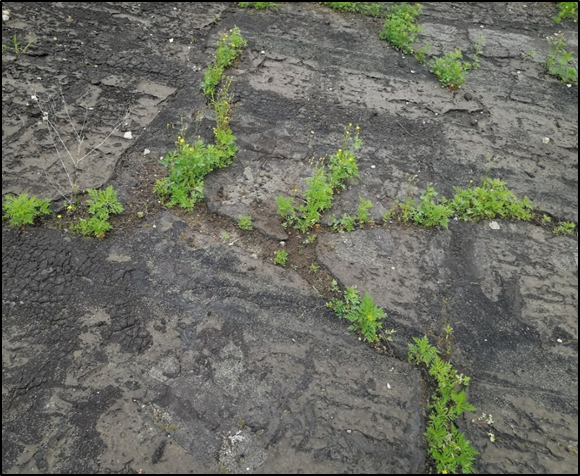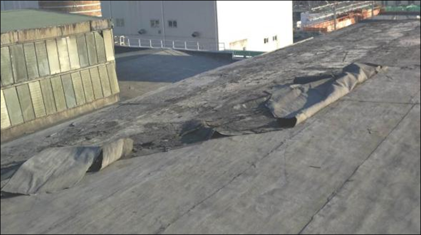 Полный износ конструкций кровли – редкое повреждение, встречается в основном на неэксплуатируемых производственных зданиях (рис. 6) или на эксплуатируемых здания, если был пропущен срок ремонта. Причиной повреждения является естественное старение конструкций кровли, что приводит к появлению трещин, просачиванию влаги в слой утеплителя, прорастанию растительности. Развитие повреждения приводит к замачиванию и разрушению плит покрытия. Техническое состояние конструкций кровли оценивается как неработоспособное или аварийное. Устраняется повреждение путем капитального ремонта плит покрытия на поврежденных участках и заменой слоев кровли.