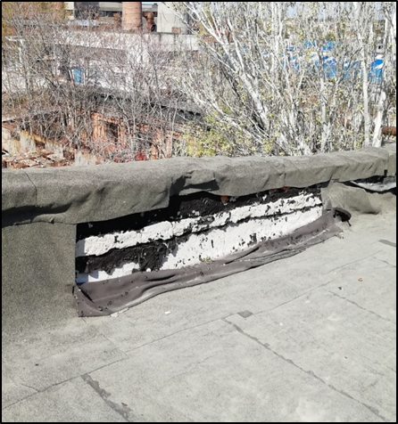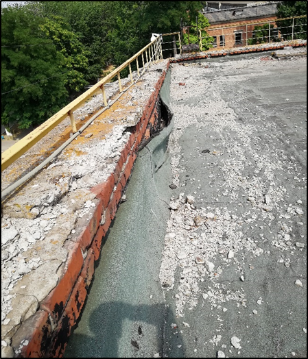 Рис. 9. Отсутствует фартук по парапету, отклеивание рулонного гидроизоляционного ковра, разрушение парапета