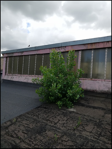 Прорастание деревьев – очень редкое повреждение, напрямую связано с полным износом кровельного покрытия. Попадая в трещины рулонного гидроизоляционного ковра, семена деревьев начинают расти, разрушая при этом корневой системой нижние слои кровли (рис. 7). Появление на кровле растительности и деревьев свидетельствует о длительном разрушении кровельного покрытия. При развитии повреждения происходит разрушение плит покрытия корнями деревьев, дополнительная нагрузка на плиты покрытия от деревьев и увеличение снеговой нагрузки в зимний период от скопления снеговых мешков. Техническое состояние кровли с древесной и кустарниковой растительностью является неработоспособным, а плит покрытия аварийным. Устраняется повреждение путем вырубки растительности и заменой всех конструкций кровли, так возможен капитальный ремонт плит покрытия.