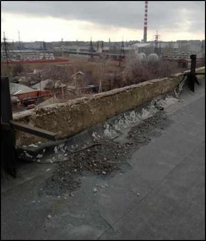 Разрушение конструкций парапета –очень редкое повреждение. В некоторых случаях на производственных зданиях делают продольный парапет между двумя пролетами здания. Так же парапет может быть выполнен при разной высоте двух соседних пролетов в здании. Причиной повреждения парапета является разрушение или отсутствие металлического фартука сверху или разрушение парапетных плит. Развитие повреждения приведет к полному разрушению кирпичной кладки парапета. Техническое состояние кирпичной кладки следует оценивать в зависимости от степени поврежденности как ограниченно работоспособное или неработоспособное. Устраняется повреждение путем восстановления кирпичной кладки на цементно-песчаном растворе и установкой фартука из оцинкованной кровельной стали.