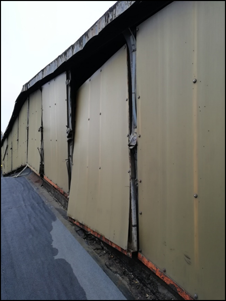 Разрушение торцевого ограждения фонаря – частое повреждение светоаэрационных фонарей. Торцевые ограждения чаще всего выполнены из волнистых асбестоцементных листов (шифера), реже выполняются из листовой стали по деревянной обрешетке, иногда выполняются деревянными, покрытыми мастикой или изоляционным материалом. Повреждения бывают в виде трещин в листах шифера, отколов листов шифера, отсутствие листов на локальных участках (рис. 15). В металлических ограждениях чаще всего встречается отсутствие антикоррозионного покрытия, отрывы отдельных стальных листов, отсутствие примыкания рулонного гидроизоляционного ковра. В деревянных ограждениях встречаются отрывы или гниение отдельных досок. Техническое состояние торцевого ограждения фонаря является ограниченно работоспособным. Устраняется повреждение путем замены разрушенных конструкций или окраской поврежденных коррозией конструкции.