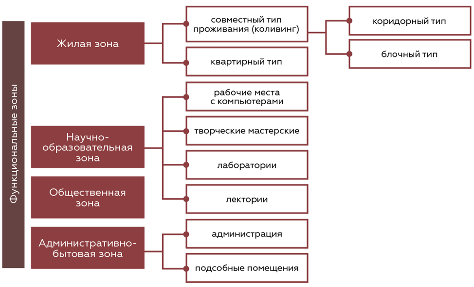 В первую очередь это жилая зона, которая может быть реализована как в виде совместного проживания, так и в виде квартир. Совместное проживание коридорного или блочного типа традиционно предоставляется обучающимся бакалавриата, специалитета или магистратуры. Квартирный тип проживания характерен для преподавательского состава и обучающихся на уровне подготовки кадров высшей квалификации.