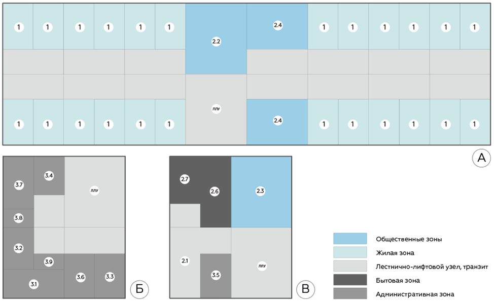 Рис. 3. А - зонирование плана типового этажа; Б - зонирование помещений административной зоны; В - зонирование входной группы и бытовых помещений