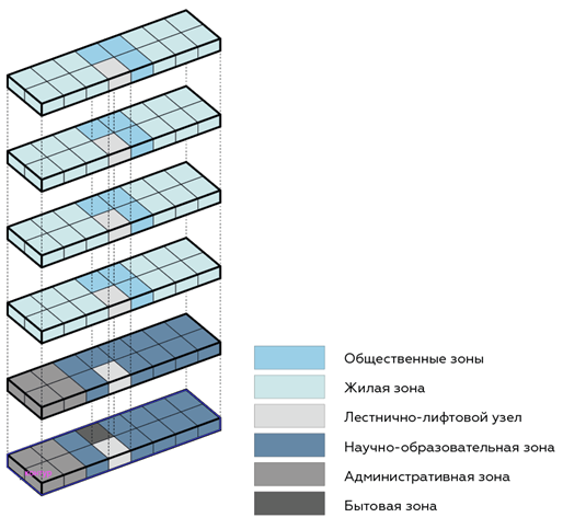 Рис. 4. Поэтажное зонирование кампуса, рассчитанного на 100 проживающих