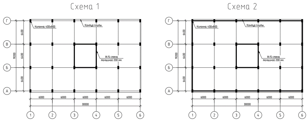 Рис. 1. Схема 1- план несущих конструкций типового этажа обеих конструктивных систем. Схема 2- план несущих конструкций 13-го этажа 2-го варианта конструирования.