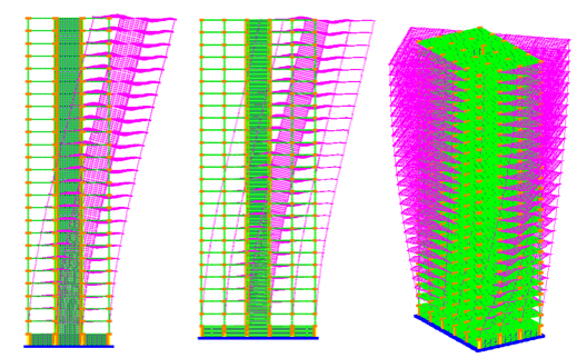 На рис. 5 показаны перемещения двух конструктивных схем, расчетом были получены значения 6130 мм. для первого случая и 4880 мм. для второго случая. Как видим введение аутригерного этажа снизило горизонтальные перемещения на 21%.