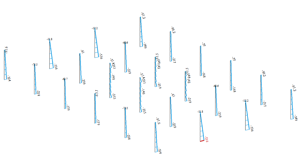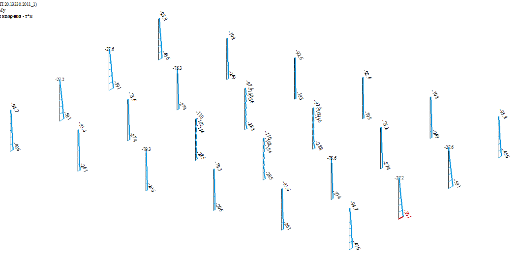 На рис. 7 показаны продольные усилия в колоннах первого этажа, максимальное сжимающее усилие в первом варианте составляет 78500 кN, во втором варианте 67900 kN. То есть продольное усилие уменьшилось на 13.5%.