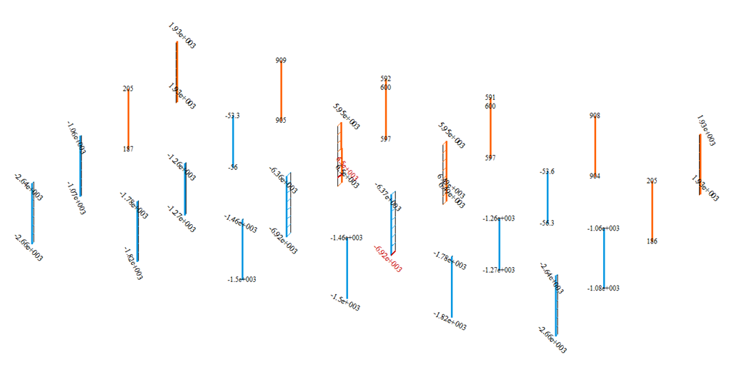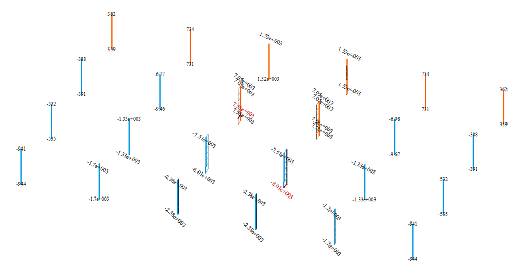 Рис. 7. Продольное усилие в колоннах 1-го этажа. (сверху 1-ый вариант конструирования, снизу 2-ой вариант конструирования). Синим цветом показаны сжатые колонны, оранжевым растянутые.