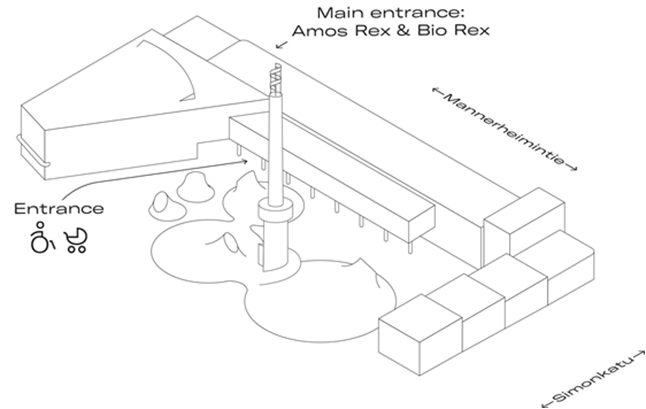 Архитектурный ансамбль состоит из здания Ласипалатси («Стеклянный замок»), кинотеатра BioRex и, непосредственно, самого музея, органично соединившего разные поколения застройки. Вход в музей осуществляется с одного из главных проспектов Хельсинки – Маннергейминти (Рис. 2).