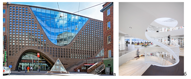 Рис. 5 а, б. Библиотека Университета Хельсинки Kaisa Talo (а. экстерьер, б. интерьер)
