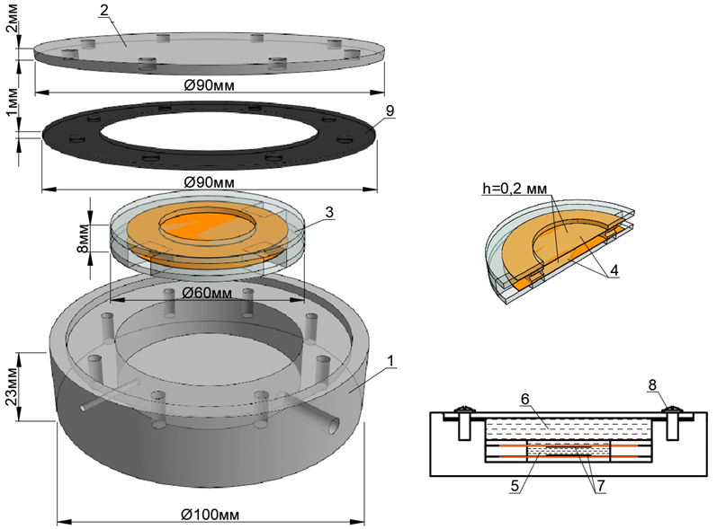 Рис. 2. Схема устройства датчика напряжений в грунте: 1 – корпус; 2 – рабочая крышка; 3 электрохимическая ячейка; 4 – упругие металлические мембраны; 5 – электролит; 6 – гидравлическая жидкость; 7 –электроизоляционное покрытие; 8 – винт; 9 – резиновая прокладка.