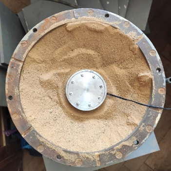 Калибровочная установка представляет собой толстостенный цилиндрический сосуд высотой 430 мм и диаметром 50 мм, заполненный грунтом, в который на глубину 100 мм был установлен прототип датчика напряжений в грунте (см. рис. 3). Месдозы устанавливались в контактный слой.