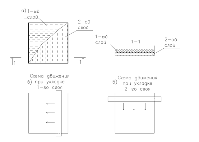 Рис.1. Схема послойной ориентации фибр (а) и схема движения установки для формирования первого (б) и второго слоя (в) при изготовлении плитных стале-фибробетонных элементов с послойной разнонаправленной ориентацией фибр.