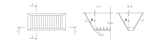 Рис.3. Конструкция бункера подачи фибробетонной смеси для плитных элементов : 1 – стальные стенки бункера; 2 – место выхода фибробетонной смеси