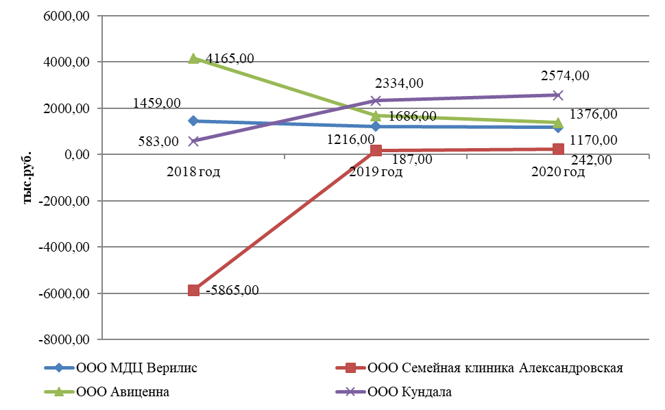 В целом можно назвать два предприятия, которые финансово неустойчивы это ООО «Семейная Клиника Александровская» и ООО «Кундала» по рассчитанным данным они имеют высокую зависимость от заемного капитала, что значительно снижает их устойчивость. В тоже время можно отметить положительную динамику коэффициентов.