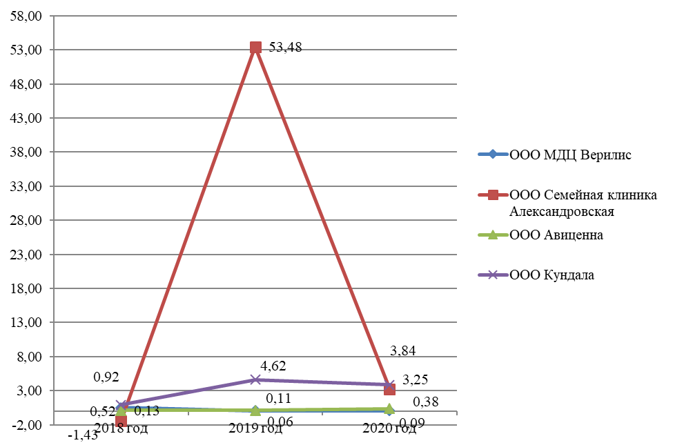 Нормативное значение данного коэффициента составляет более 0,5. Два предприятия показывают зависимость от заемного капитала — это ООО «Семейная Клиника Александровская» и ООО «Кундала», чуть более 20% имущества этих предприятий сформировано за счет собственных средств. В тоже время можно отметить положительную динамику коэффициентов для этих предприятий в текущем периоде, что говорит о тенденции роста их устойчивости. У двух оставшихся предприятий можно отметить ухудшение динамки коэффициента, однако он остается в пределах нормы.