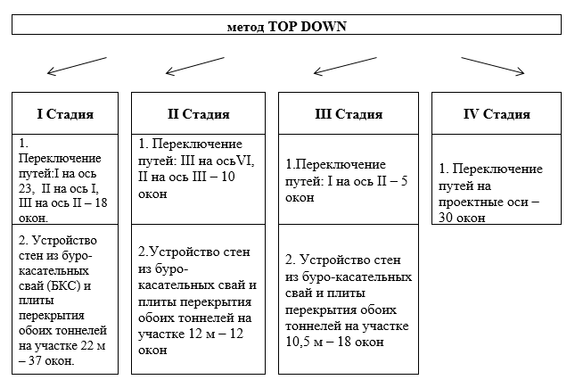 На практике строительство подземных сооружений существует менее распространенный способ – метод TOPDOWN (с применением буро-касательных свай). [17]. При таком методе строительство осуществляется в 4 -стадии, с перекладкой путей на каждой стадии, с переустройством контактной сети и сетей СЦБ.