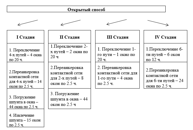 Общая продолжительность строительных работ определяется на стадии проектирования. При открытом способе строительство тоннелей осуществляется в 4 (четыре) стадии, с перекладкой путей на каждой стадии, с переустройством контактной сети и сетей СЦБ.