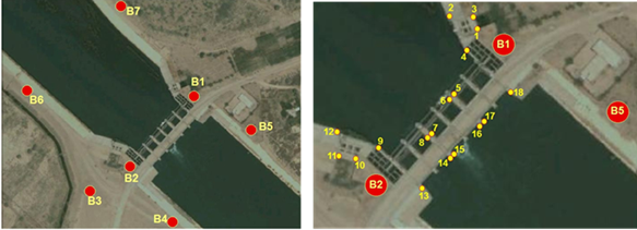 - Важность изучения: Изучение и оценка движения изучаемой плотины и окружающих ее территорий, а также определение объемов и тенденций этих движений в четырех измерениях (X, Y, Z и время) путем слияния традиционных методов съемки и GPS. Особенно после появления трещин в окружающем его грунте и наблюдения подвижек в некоторых швах и краях трещин.