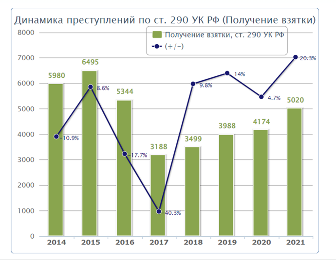 35. Количество зарегистрированных преступлений по статье 291 УК РФ «Получение взятки» / Генеральная прокуратура РФ. Портал правовой статистики [Электронный ресурс]. Режим доступа: http://crimestat.ru/regions_chart_total (дата обращения: 20.06.2022).
