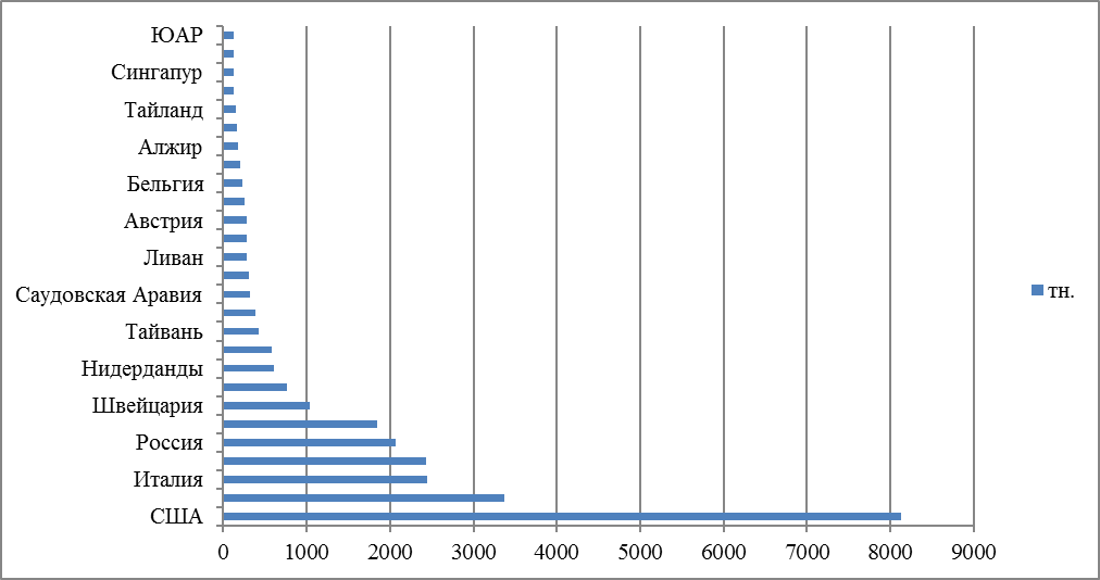 Рисунок 1 – Объем монетарного золота в резервах стран мира (по состоянию на 2020 г.)