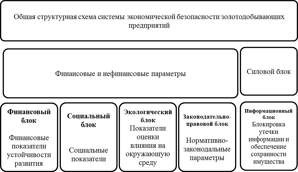 В свою очередь финансовый блок в своем составе должен иметь надежную систему безопасности финансовых ресурсов и операций, связанных с их движением. Социальный блок должен определять общее настроение и удовлетворенность персонала условиями труда и системой оценки их труда. Экологический блок должен отвечать за сохранность окружающей среды в общей национальной политике. Информационный блок должен учитывать важность, как входящей, так и исходящей информации, отвечающей требованиям конфиденциальности золотодобывающих предприятий. Законодательно-правовой блок должен включать условия соблюдения российской законодательной базы. Силовой блок, своевременно реагировать и смягчать угрозы экономической безопасности золотодобывающих предприятий. Общая структурная схема системы экономической безопасности золотодобывающих предприятий представлена на Рисунке 2.