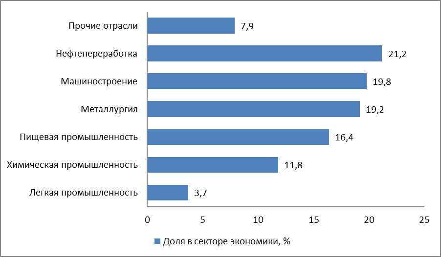 Анализируя представленные данные Росстата можно сделать вывод, что нефтеперерабатывающая промышленность занимает наибольшую доля в секторе экономики 21,2 %, также высокую долю занимают металлургическая и машиностроительная промышленность 19,2 и 19,8 % соответственно [4].