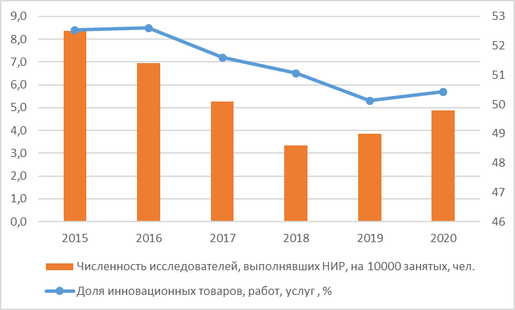 Рисунок 3. Численность исследователей, выполняющих НИР и доля инновационной продукции в общем объеме товаров, работ и услуг в Российской Федерации