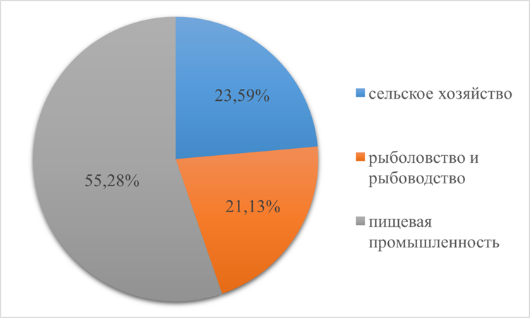 В целом общий экономический оборот агропромышленного комплекса Краснодарского края составил свыше 145 млрд рублей и охватил производство порядка пятисот производственных предприятий и организаций. Стоит отметить, что наибольшую долю в обороте рынка продовольственных товаров составила отрасль пищевой промышленности, которая консолидировала 80,6 млрд рублей, распределённых между 187 предприятиями. Сразу после пищевой промышленности следует сельское хозяйство и рыболовный промысел с 34,4 и 30,8 млрд рублей соответственно (Рисунок 2).