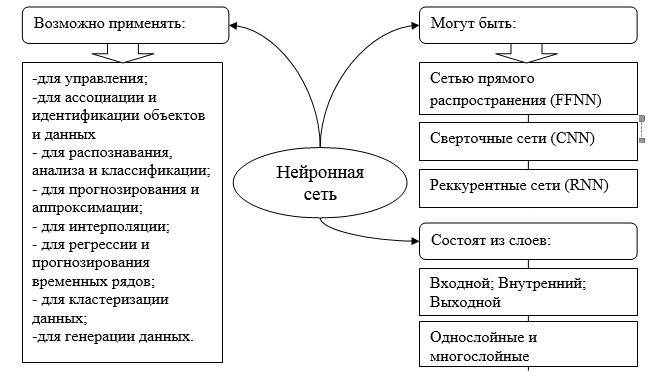 Искусственный интеллект, инструмент работы с большими объемами данных основан на применении нейронных сетей – программных алгоритмов, схожих по структуре с нейронами головного мозга человека. Возможное варианты применения нейронных сетей и наиболее распространенные алгоритмы его осуществления представлены на рисунке 1.