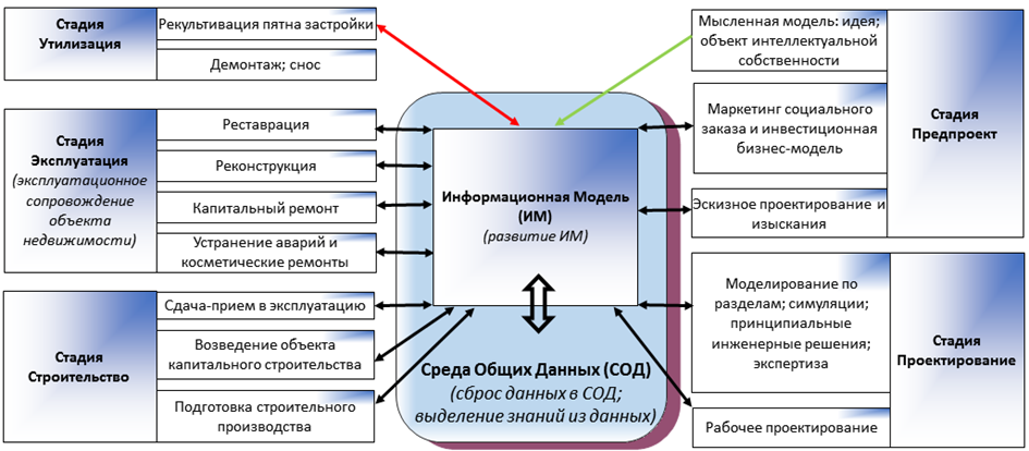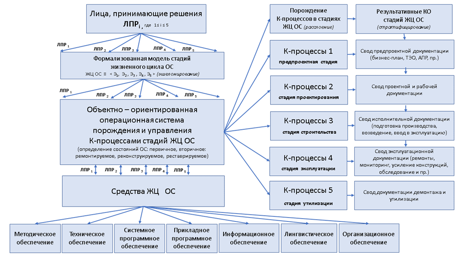 Особо отметим, что сам СД ОС является исходными источником для исполнения этапов материального производства, строительства, эксплуатации ОС. Материальной базой исполнения этих этапов являются: индустрия производства материалов, конструктивных элементов; множество строительных машин, механизмов, оборудования; выполнение требований технологии и организации строительства; наличие различных ресурсов (электричество, вода, дороги, и т.п.). Информационные модели, порождающие СД ОС создают условия автоматизации материальной деятельности ЛПР при производстве ОС, в том числе с применением робототехники в монтаже, отделке, эксплуатации оборудования. Естественно, кадры ЛПР обязаны владеть автоматизированными технологиями на всех стадиях ЖЦ ОС, в том числе и материального производства в составе этапов: подготовка производства, возведение объекта, ввод в эксплуатацию, ремонты, реконструкция, демонтаж ОС [13].