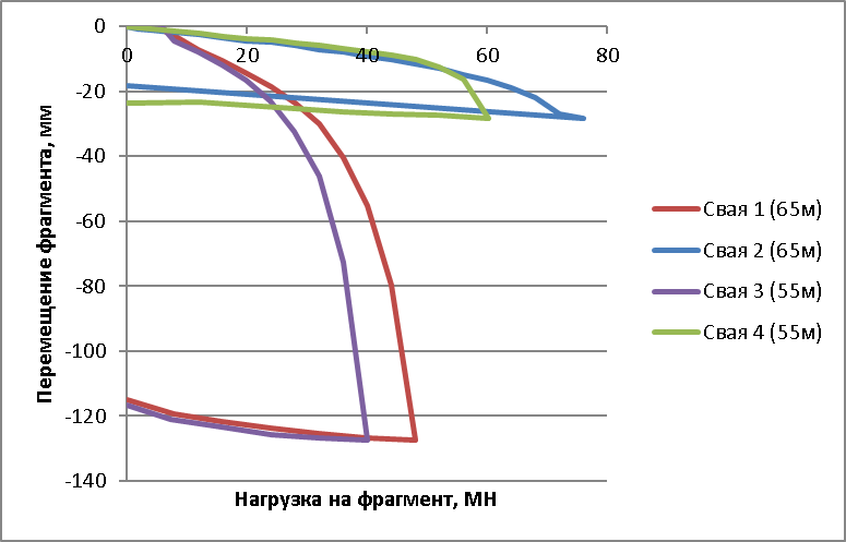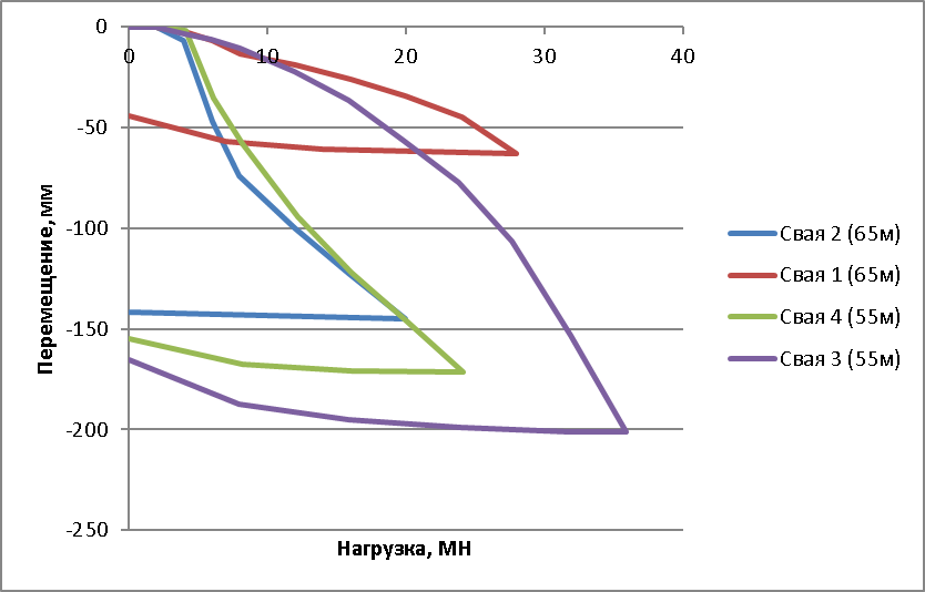 Наибольшая величина нагрузки, достигнутая при испытании нижнего уровня нагружения, составила 36МН (свая 3), наименьшая 24 МН (свая 4).