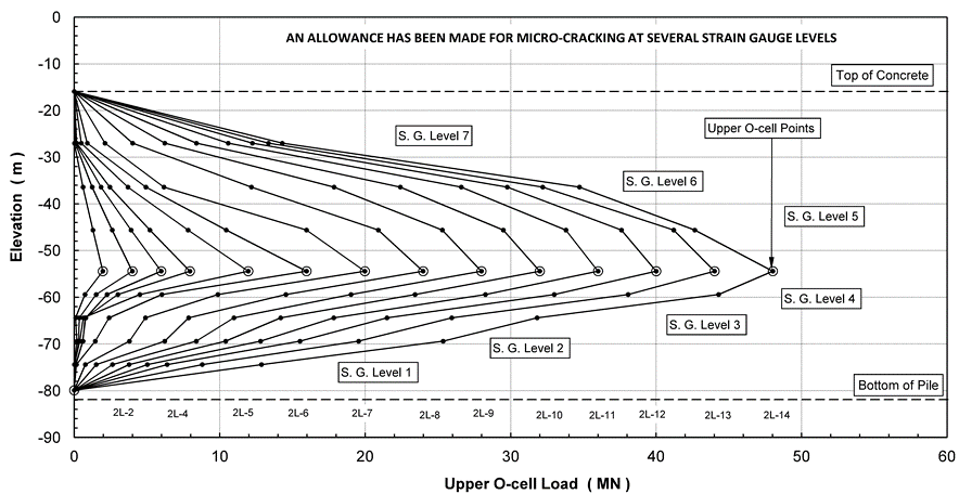 При нагружении верхнего уровня домкратов наблюдается резкое затухание напряжений в прочных слоях грунта на отметках -25…-80 м. С увеличением нагрузки происходит перераспределение усилий по стволу сваи и вовлечение в работу относительно слабых грунтов на отметках (+3…-40).
