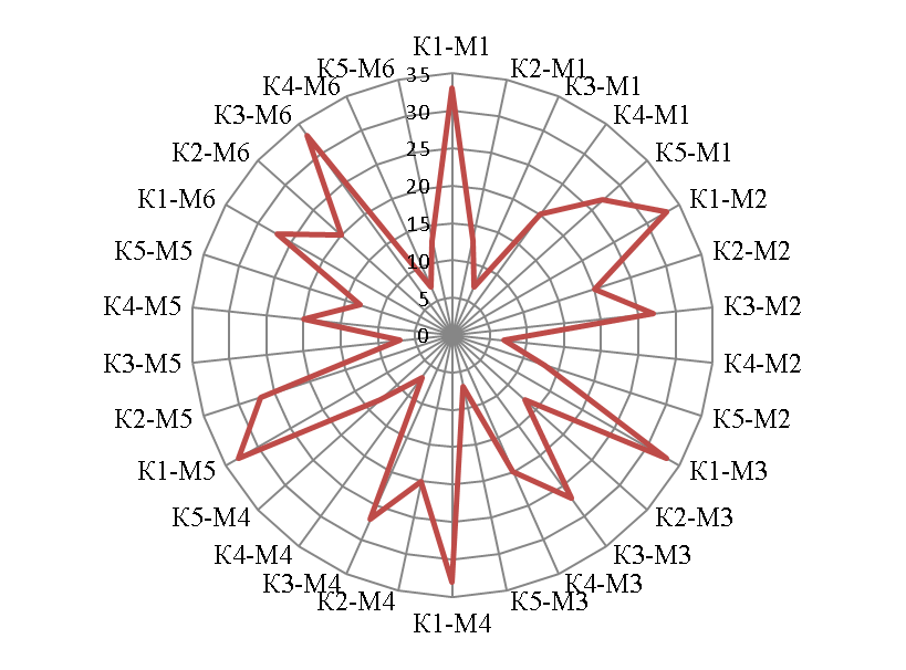 При комплексном построении матриц парных сравнений полученные данные использованы для определения важности критериев по заданным мероприятиям при выполнении ремонтно-строительных работ. В качестве исходных данных применены векторы приоритетов с учетом их нормализации и ранжированные критерии, соответствующие данным мероприятиям (таблица 5).