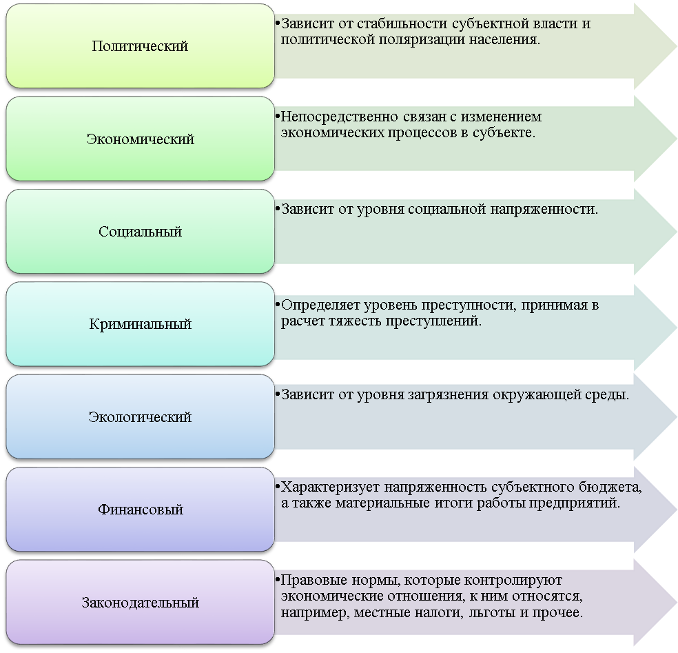 Однако уже сейчас можно говорить о том, что к так называемым дестабилизаторам экономики относятся инвестиционные риски, связанные в первую очередь с обесцениванием капитала, а также инвестиционные угрозы. Для оценки возможной утрате инвестиций, а, следовательно, и дохода от них, используют такое понятие как «инвестиционный риск». Конкретно для регионов можно обособить следующие типы риска, изображенный на рисунке 1, ниже представлены определения каждого из них: