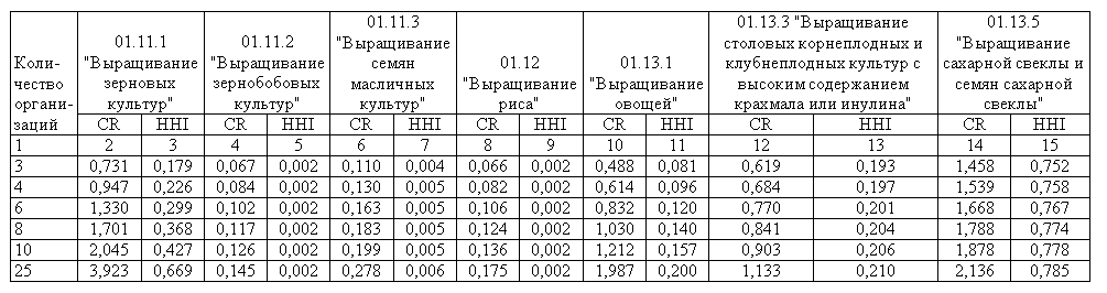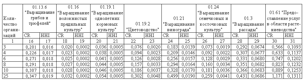 Таблица 3 – Показатели концентрации для растениеводческих организаций по видам деятельности ОКВЭД